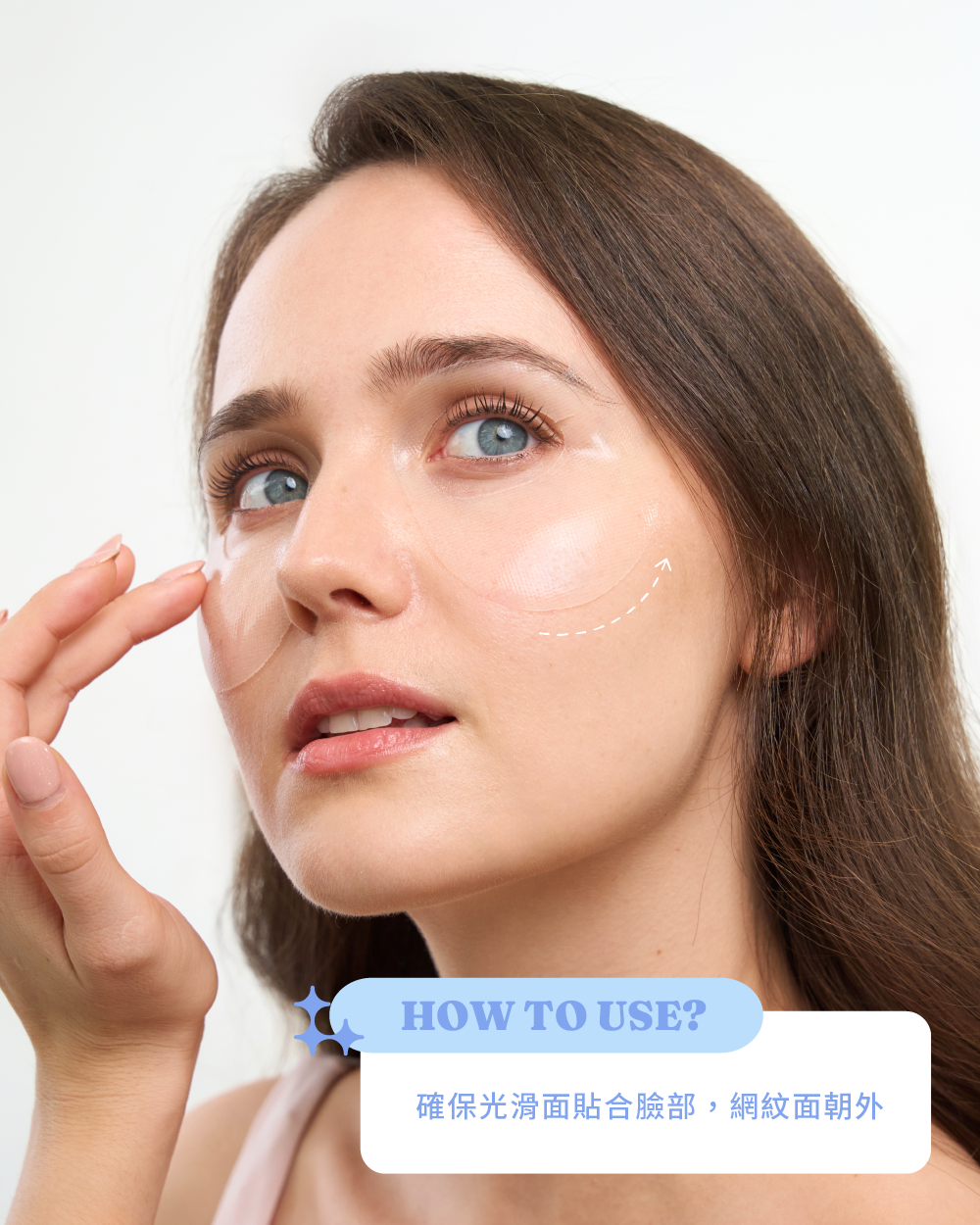 2. 將眼膜有白色膜的一面貼在眼周肌膚上,確保翼狀部分朝向耳朵。